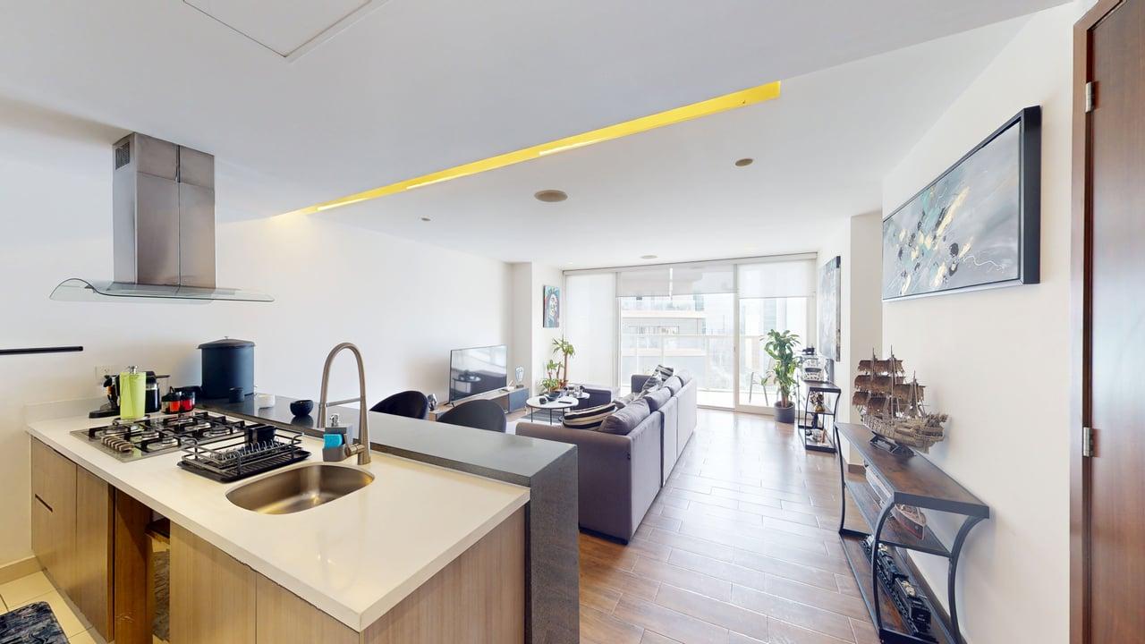Cocina abierta con barra de granito que se integra a la estancia, ideal para convivir y disfrutar.