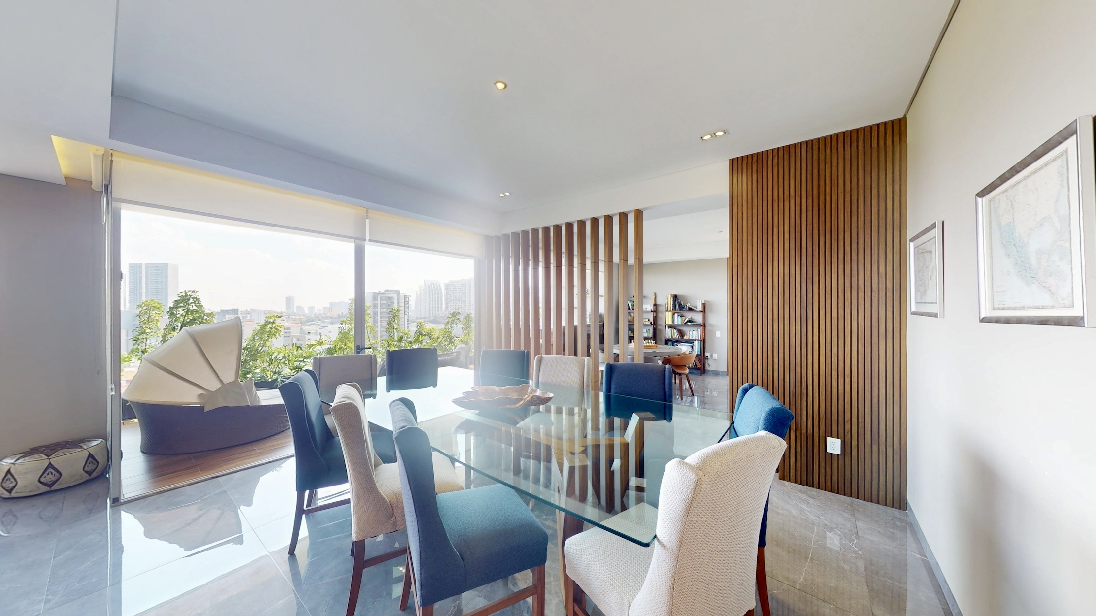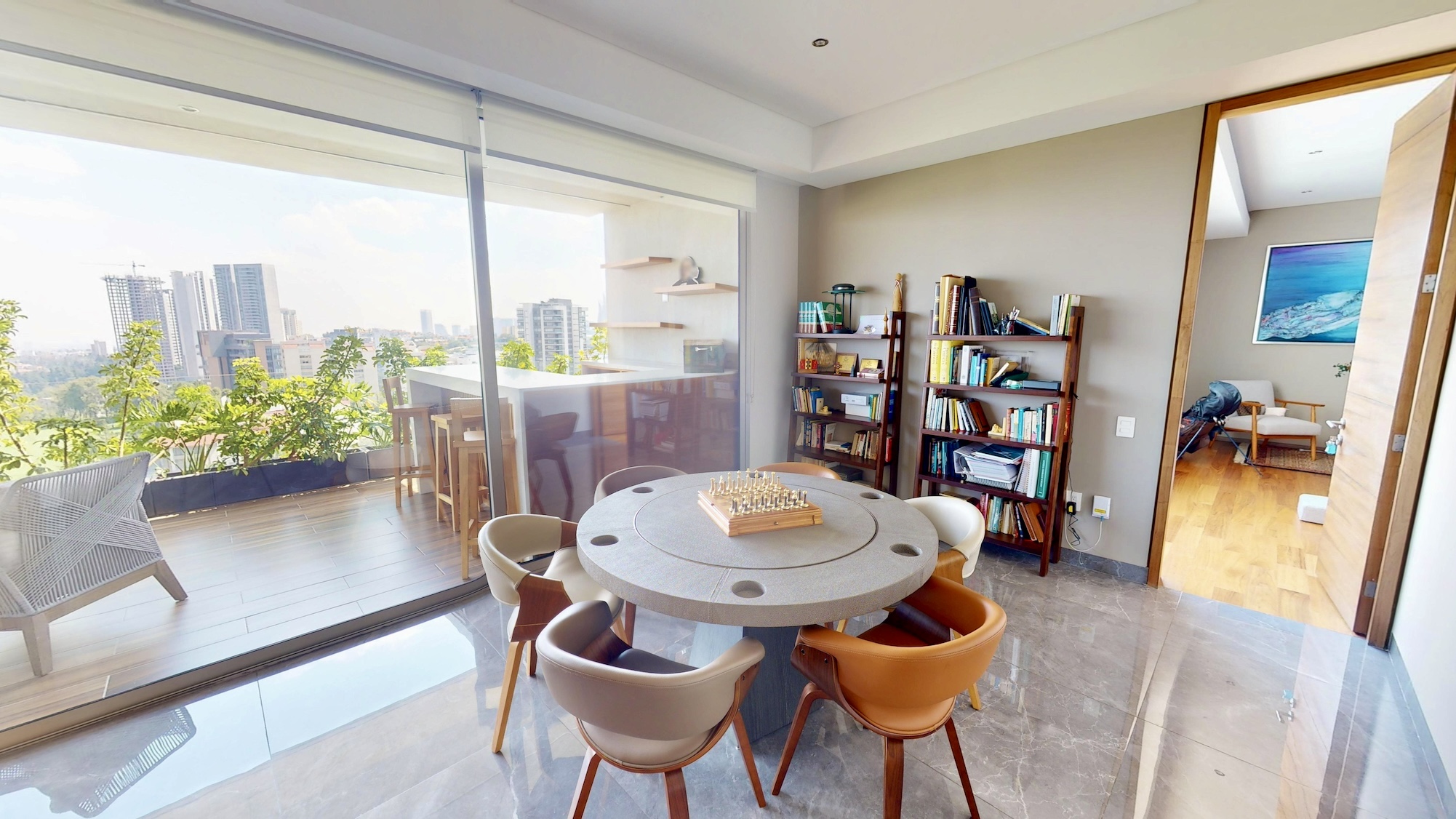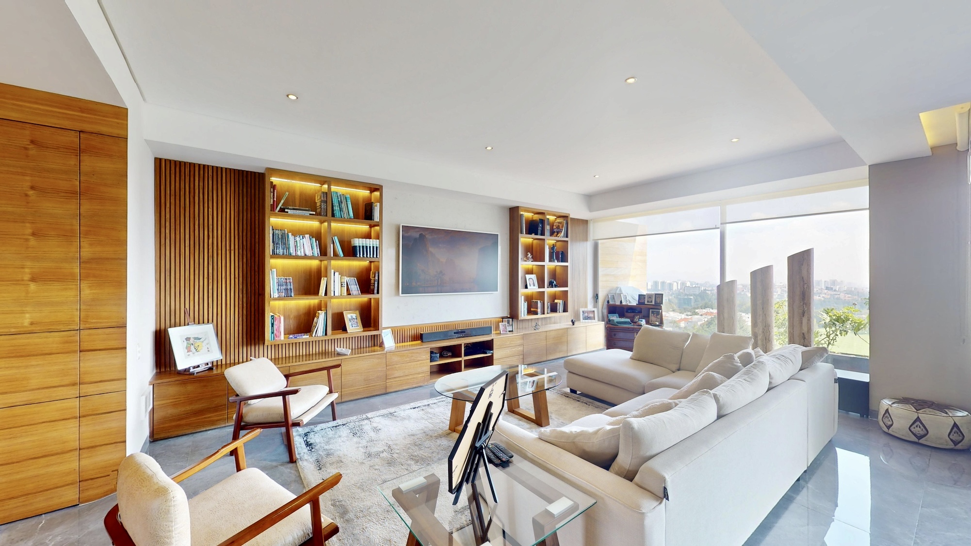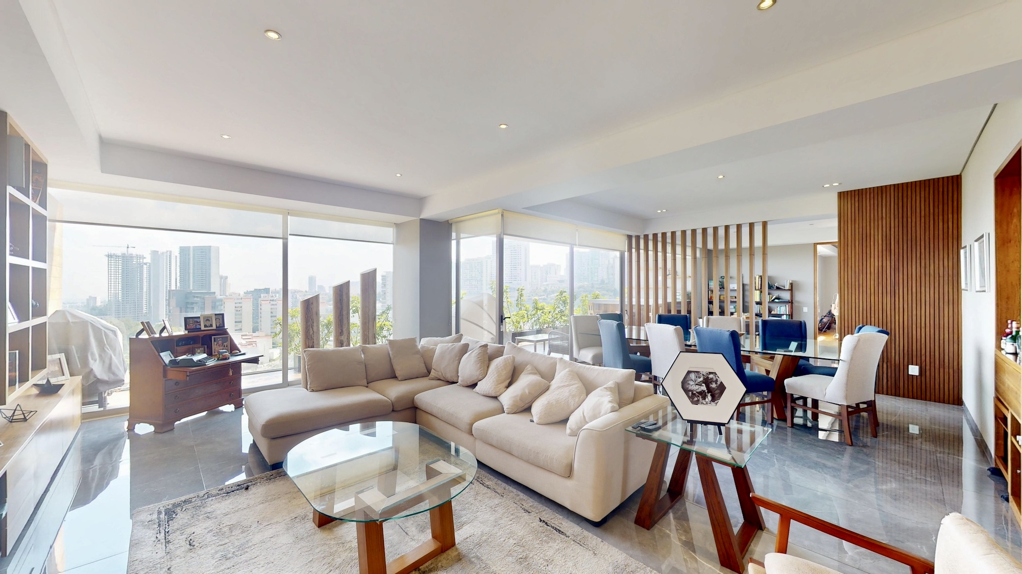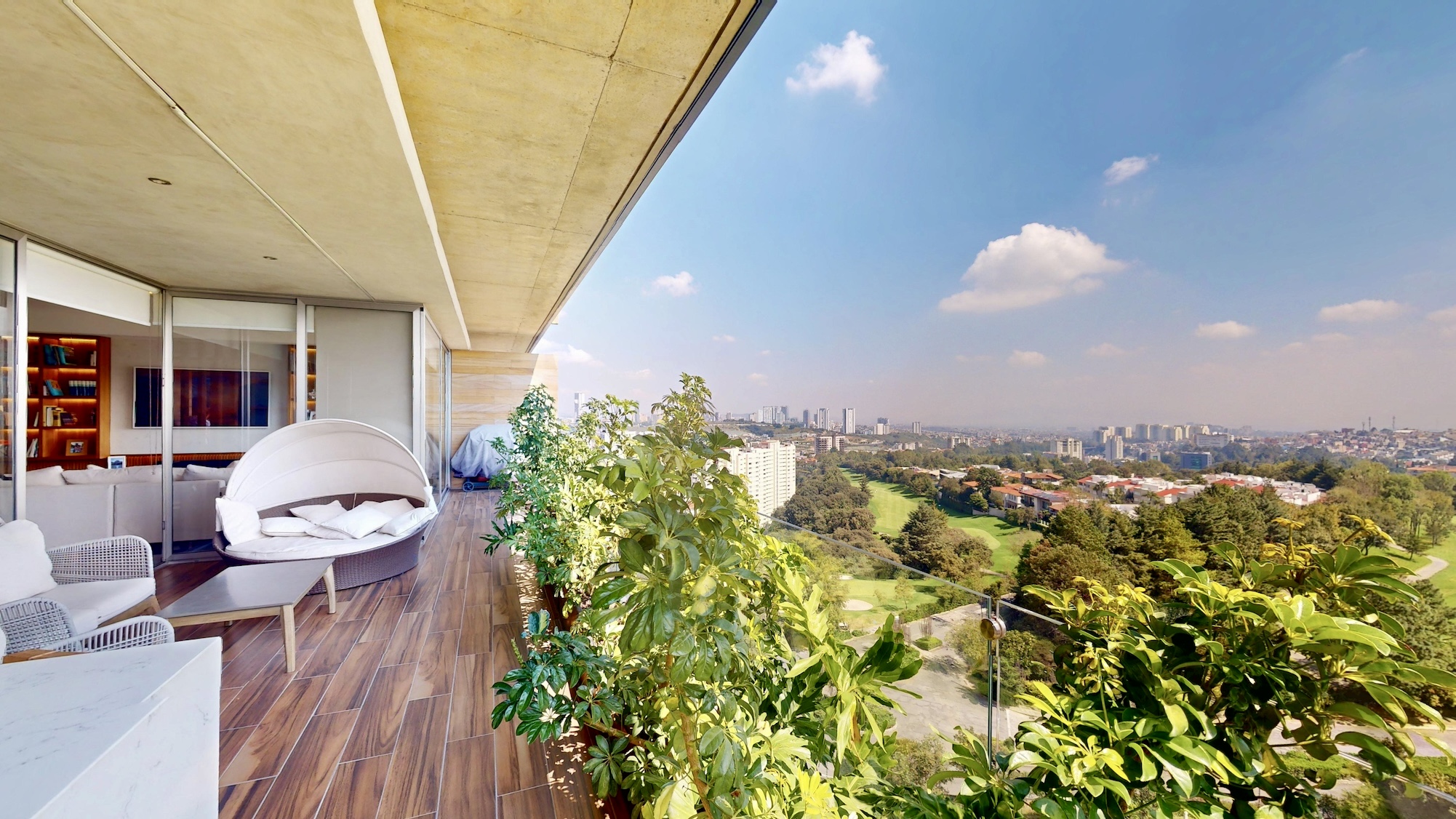 Sala y comedor con ventanales de piso a techo y acceso directo a una terraza con vista panorámica al campo de golf del Lomas Country Club.