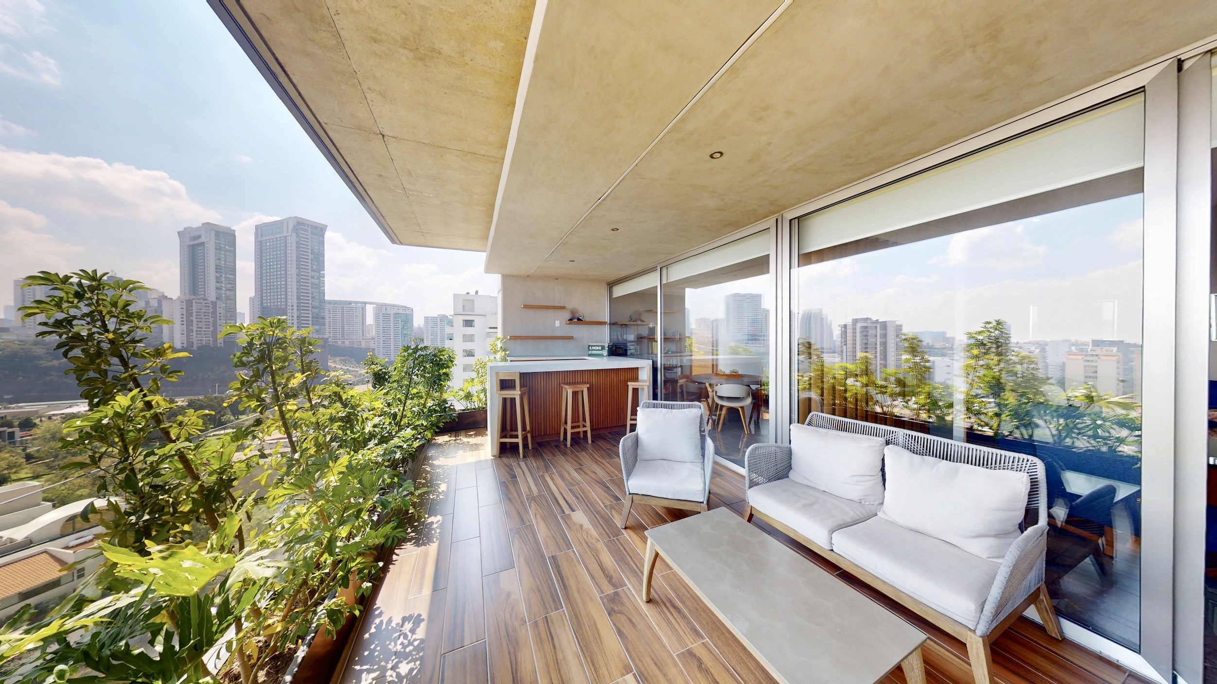 Terraza amplia con barra de cuarzo, perfecta para reuniones o relajarte al atardecer.
